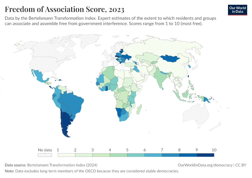“Data Page: Freedom of Association Score”, part of the following publication: Bastian Herre, Lucas Rodés-Guirao, and Esteban Ortiz-Ospina (2013) - “Democracy”. Data adapted from Bertelsmann Transformation Index. Retrieved from https://edit-mdim.owid.pages.dev:8789/20260204-165456/grapher/freedom-of-association-score-bti.html [online resource] (archived on February 4, 2026).How to cite this data