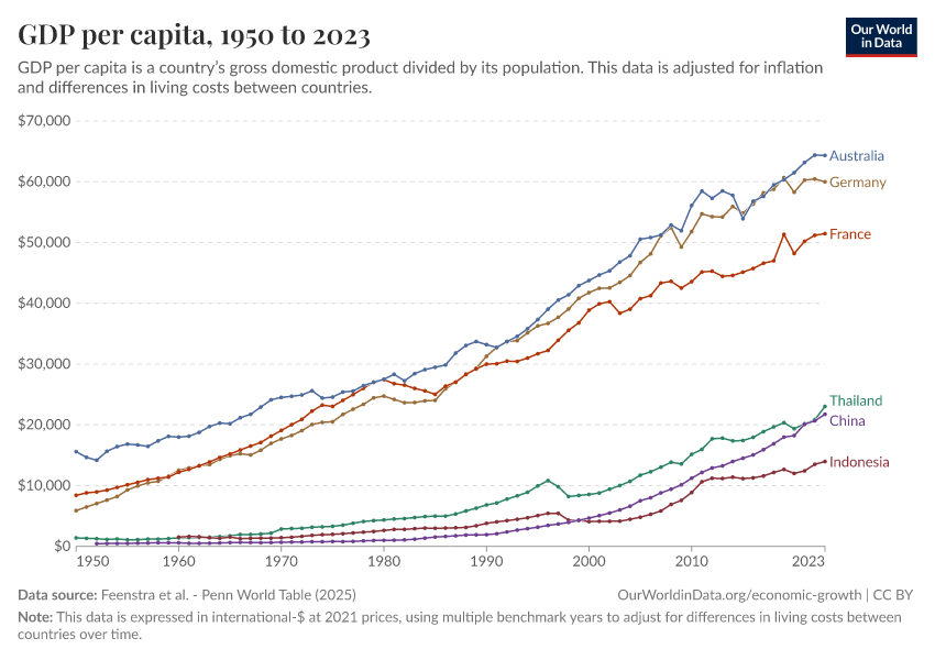 “Data Page: GDP per capita”, part of the following publication: Max Roser, Bertha Rohenkohl, Pablo Arriagada, Joe Hasell, Hannah Ritchie, and Esteban Ortiz-Ospina (2023) - “Economic Growth”. Data adapted from Feenstra et al.. Retrieved from https://edit-mdim.owid.pages.dev:8789/20251013-111729/grapher/gdp-per-capita-penn-world-table.html [online resource] (archived on October 13, 2025).How to cite this data
