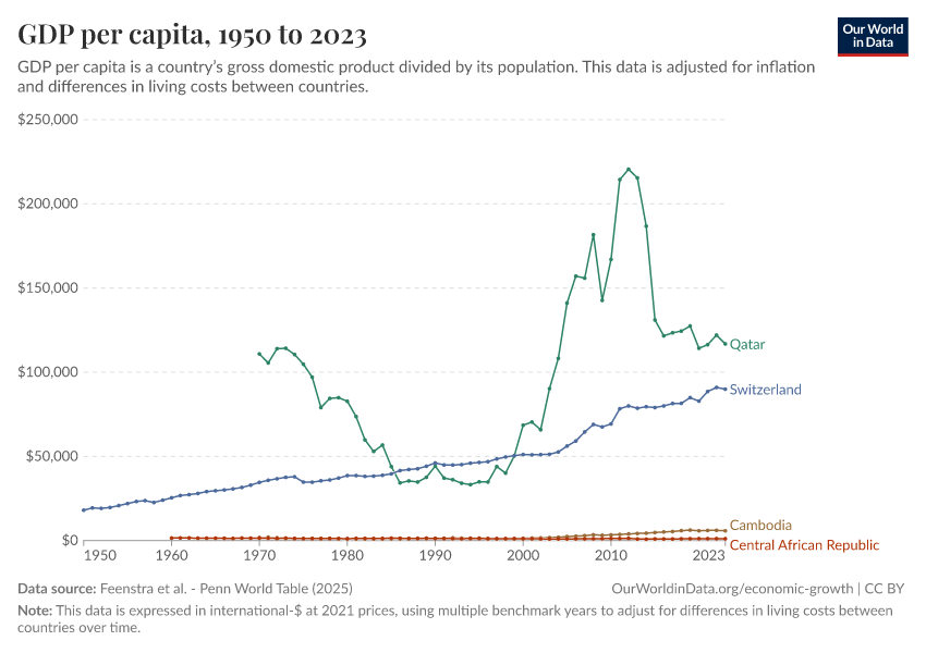 “Data Page: GDP per capita”, part of the following publication: Max Roser, Bertha Rohenkohl, Pablo Arriagada, Joe Hasell, Hannah Ritchie, and Esteban Ortiz-Ospina (2023) - “Economic Growth”. Data adapted from Feenstra et al.. Retrieved from https://edit-mdim.owid.pages.dev:8789/20251013-111729/grapher/gdp-per-capita-penn-world-table.html [online resource] (archived on October 13, 2025).How to cite this data