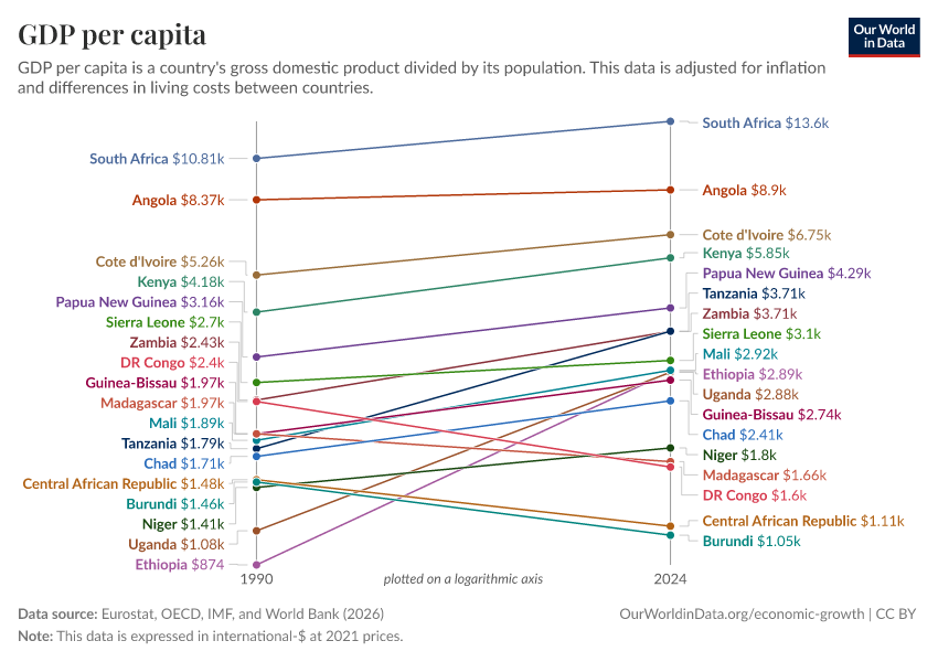 • This data comes from the World Bank and starts in 1990. For estimates going back several centuries, explore our chart of GDP per capita from the Maddison Project Database.