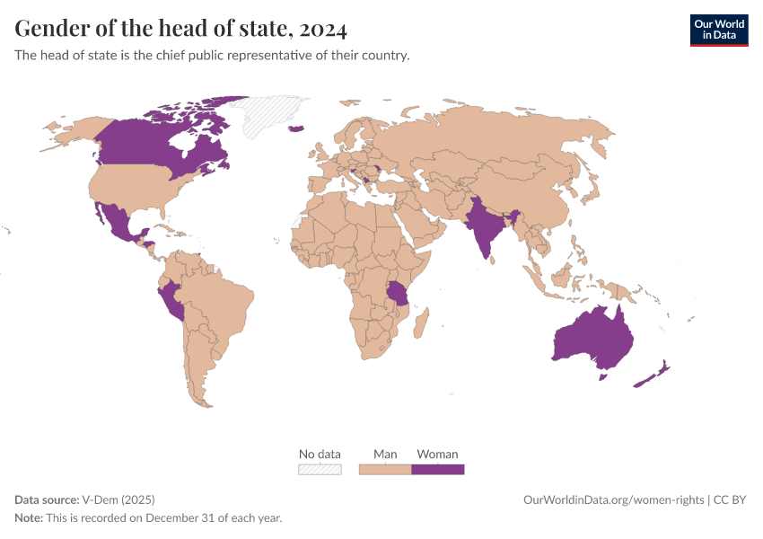 V-Dem (2025) – processed by Our World in Data. “Gender of the head of state” [dataset]. V-Dem, “Democracy report v15” [original data]. Retrieved February 24, 2026 from https://edit-mdim.owid.pages.dev:8789/20260119-070102/grapher/gender-of-the-head-of-state.html (archived on January 19, 2026).