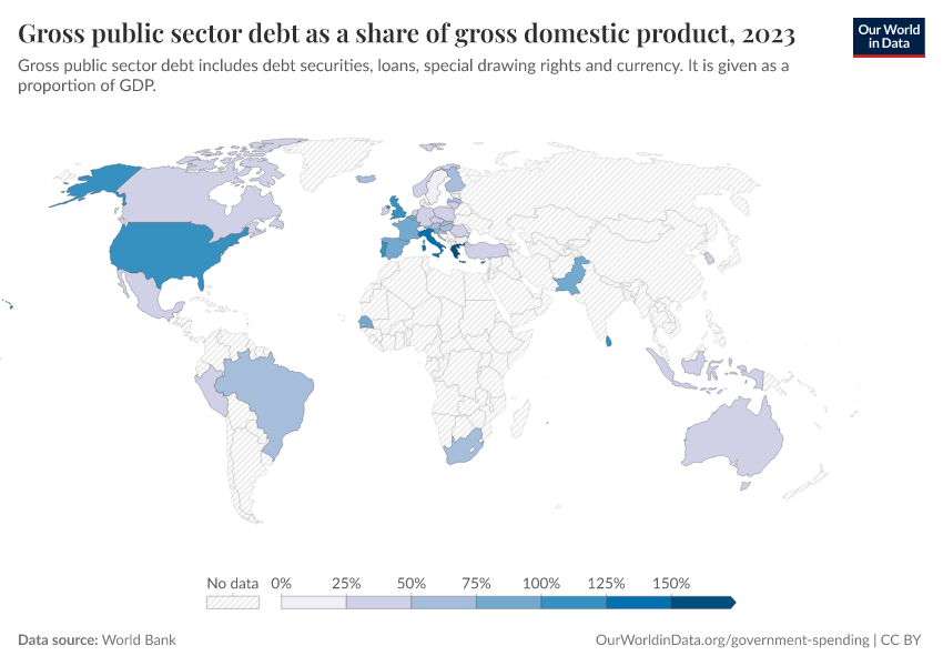 “Data Page: Gross public sector debt as a share of gross domestic product”. Our World in Data (2026). Data adapted from World Bank. Retrieved from https://edit-mdim.owid.pages.dev:8789/20251120-211749/grapher/gross-public-sector-debt-as-a-proportion-of-gdp.html [online resource] (archived on November 20, 2025).How to cite this data