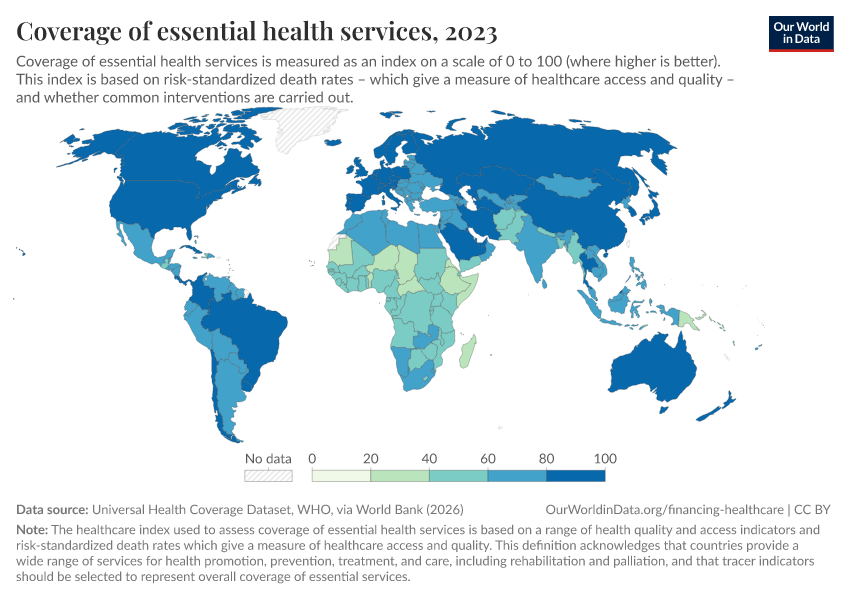 “Data Page: Coverage of essential health services”. Our World in Data (2026). Data adapted from Universal Health Coverage Dataset, WHO, via World Bank. Retrieved from https://edit-mdim.owid.pages.dev:8789/20260202-181317/grapher/healthcare-access-quality-un.html [online resource] (archived on February 2, 2026).How to cite this data