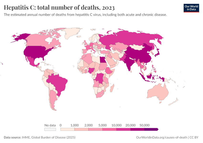 “Data Page: Hepatitis C: total number of deaths”, part of the following publication: Esteban Ortiz-Ospina and Max Roser (2016) - “Global Health”. Data adapted from IHME, Global Burden of Disease. Retrieved from https://edit-mdim.owid.pages.dev:8789/20260211-174736/grapher/hepatitis-c-number-of-deaths.html [online resource] (archived on February 11, 2026).How to cite this data