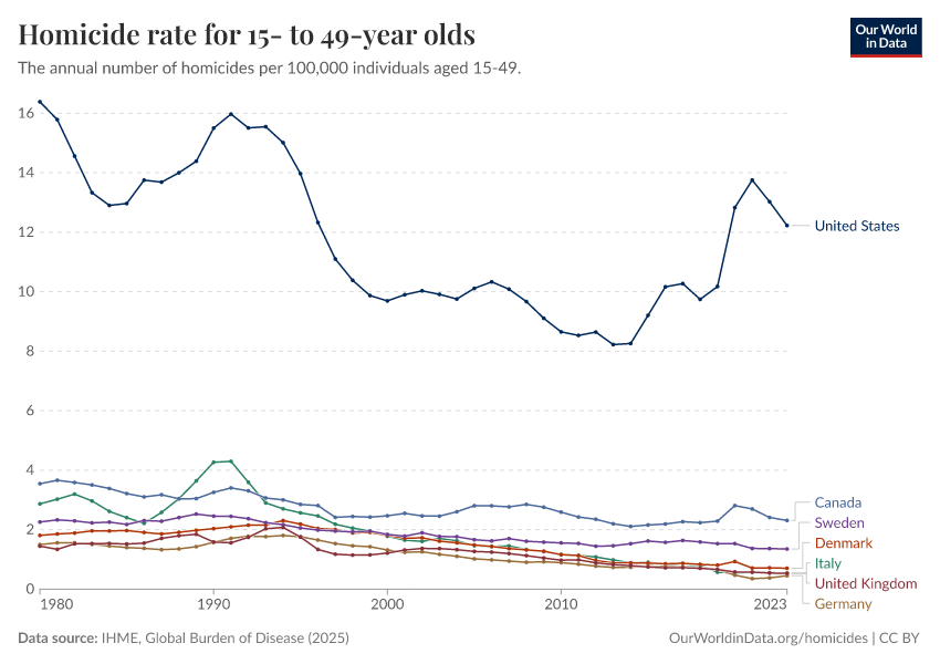 “Data Page: Homicide rate for 15- to 49-year olds”, part of the following publication: Esteban Ortiz-Ospina and Max Roser (2016) - “Global Health”. Data adapted from IHME, Global Burden of Disease. Retrieved from https://edit-mdim.owid.pages.dev:8789/20260211-174736/grapher/homicide-rate-in-15--to-49-year-olds.html [online resource] (archived on February 11, 2026).How to cite this data