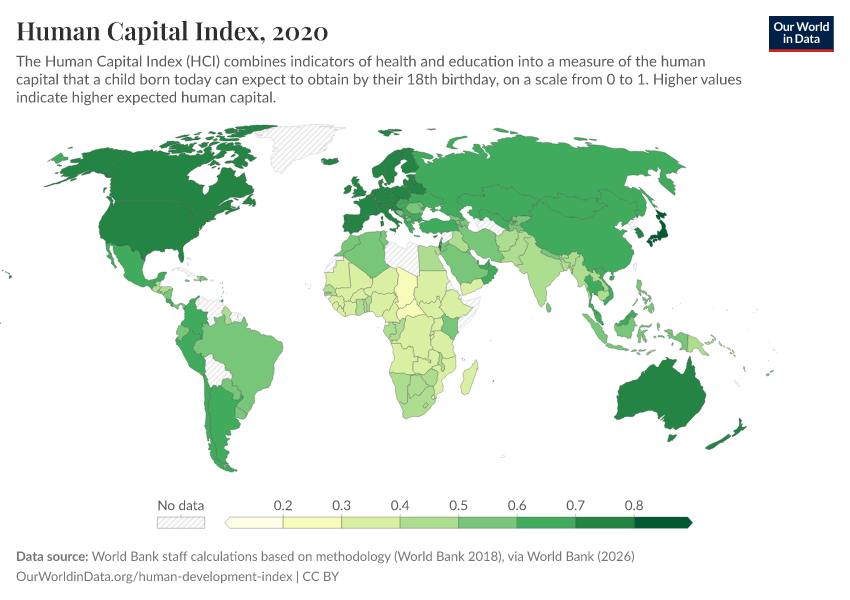 “Data Page: Human Capital Index”. Our World in Data (2026). Data adapted from World Bank staff calculations based on methodology (World Bank 2018), via World Bank. Retrieved from https://edit-mdim.owid.pages.dev:8789/20260202-181317/grapher/human-capital-index-in-2018.html [online resource] (archived on February 2, 2026).How to cite this data