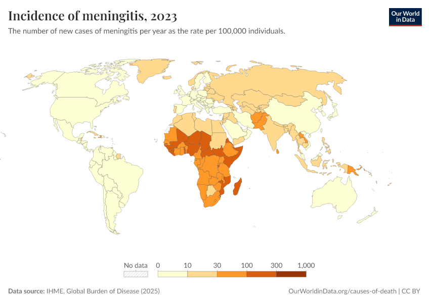 “Data Page: Incidence of meningitis”, part of the following publication: Esteban Ortiz-Ospina and Max Roser (2016) - “Global Health”. Data adapted from IHME, Global Burden of Disease. Retrieved from https://edit-mdim.owid.pages.dev:8789/20260212-172859/grapher/incidence-of-meningitis.html [online resource] (archived on February 12, 2026).How to cite this data