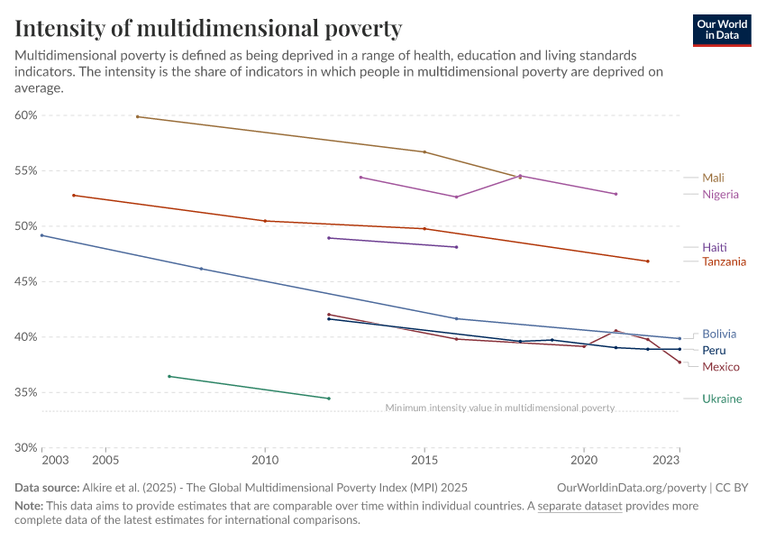 “Data Page: Intensity of multidimensional poverty”, part of the following publication: Joe Hasell, Bertha Rohenkohl, Pablo Arriagada, Esteban Ortiz-Ospina, and Max Roser (2022) - “Poverty”. Data adapted from Alkire et al.. Retrieved from https://edit-mdim.owid.pages.dev:8789/20251229-175603/grapher/intensity-of-multidimensional-poverty-hot.html [online resource] (archived on December 29, 2025).How to cite this data