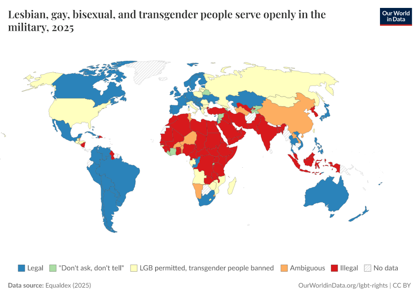 “Data Page: Lesbian, gay, bisexual, and transgender people serve openly in the military”, part of the following publication: Bastian Herre and Pablo Arriagada (2023) - “LGBT+ Rights”. Data adapted from Equaldex. Retrieved from https://edit-mdim.owid.pages.dev:8789/20250909-093708/grapher/lgbt-military-equaldex.html [online resource] (archived on September 9, 2025).How to cite this data