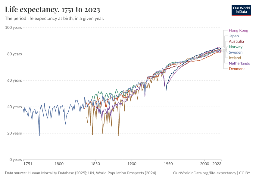 “Data Page: Life expectancy at birth”, part of the following publication: Saloni Dattani, Lucas Rodés-Guirao, Hannah Ritchie, Esteban Ortiz-Ospina, and Max Roser (2023) - “Life Expectancy”. Data adapted from Human Mortality Database, United Nations. Retrieved from https://edit-mdim.owid.pages.dev:8789/20251022-222946/grapher/life-expectancy-hmd-unwpp.html [online resource] (archived on October 22, 2025).How to cite this data