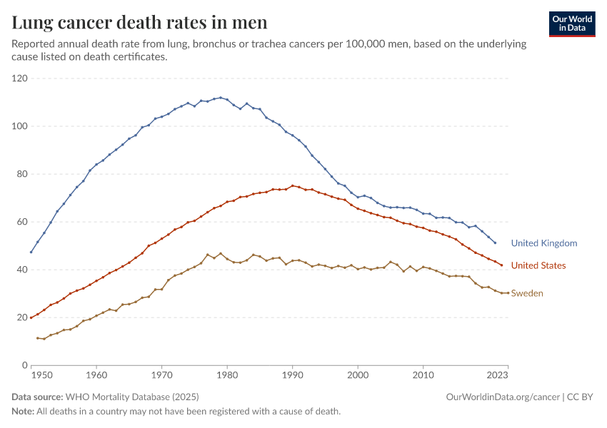 “Data Page: Lung cancer death rates in men”, part of the following publication: Saloni Dattani, Fiona Spooner, Hannah Ritchie, and Max Roser (2023) - “Causes of Death”. Data adapted from WHO Mortality Database. Retrieved from https://edit-mdim.owid.pages.dev:8789/20250909-093708/grapher/lung-cancer-death-rates-males.html [online resource] (archived on September 9, 2025).How to cite this data