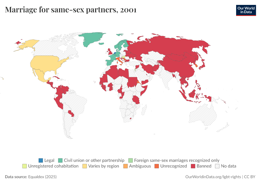 “Data Page: Marriage for same-sex partners”, part of the following publication: Bastian Herre and Pablo Arriagada (2023) - “LGBT+ Rights”. Data adapted from Equaldex. Retrieved from https://edit-mdim.owid.pages.dev:8789/20250909-093708/grapher/marriage-same-sex-partners-equaldex.html [online resource] (archived on September 9, 2025).How to cite this data