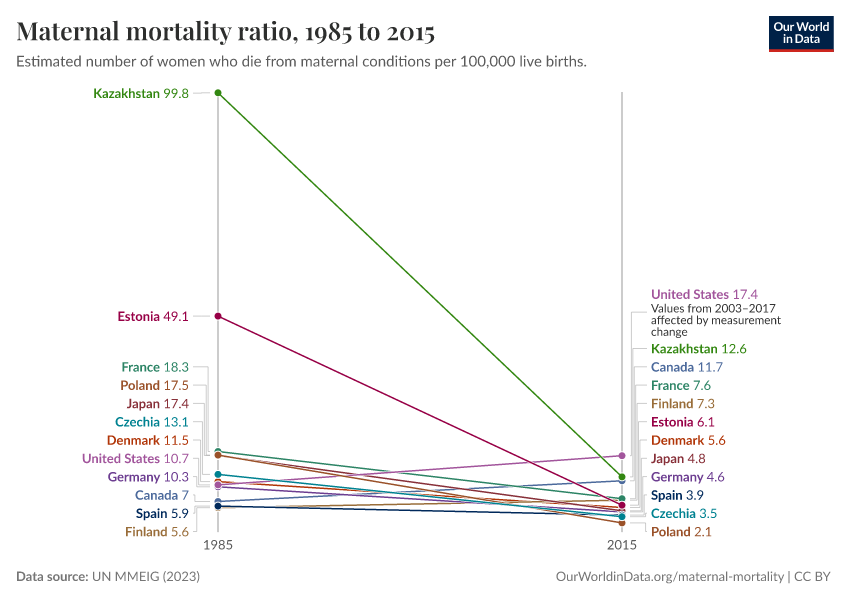 UN MMEIG (2023) – processed by Our World in Data. “Maternal mortality ratio” [dataset]. UN MMEIG (WHO, UNICEF, UNFPA, World Bank Group and UNDESA/ Population Division), “Trends in maternal mortality 2020” [original data]. Retrieved February 24, 2026 from https://edit-mdim.owid.pages.dev:8789/20260119-065148/grapher/maternal-mortality-slope-chart.html (archived on January 19, 2026).