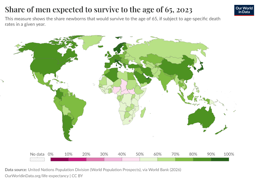 “Data Page: Share of men expected to survive to the age of 65”. Our World in Data (2026). Data adapted from United Nations Population Division (World Population Prospects), via World Bank. Retrieved from https://edit-mdim.owid.pages.dev:8789/20260202-181317/grapher/men-survival-to-age-65.html [online resource] (archived on February 2, 2026).How to cite this data