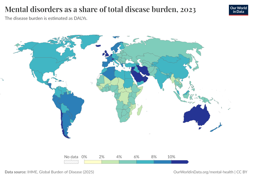 IHME, Global Burden of Disease (2025) – with major processing by Our World in Data. “Mental disorders as a share of total disease burden” [dataset]. IHME, Global Burden of Disease, “Global Burden of Disease - DALYs” [original data]. Retrieved February 24, 2026 from https://edit-mdim.owid.pages.dev:8789/20260211-174736/grapher/mental-and-substance-use-as-share-of-disease.html (archived on February 11, 2026).