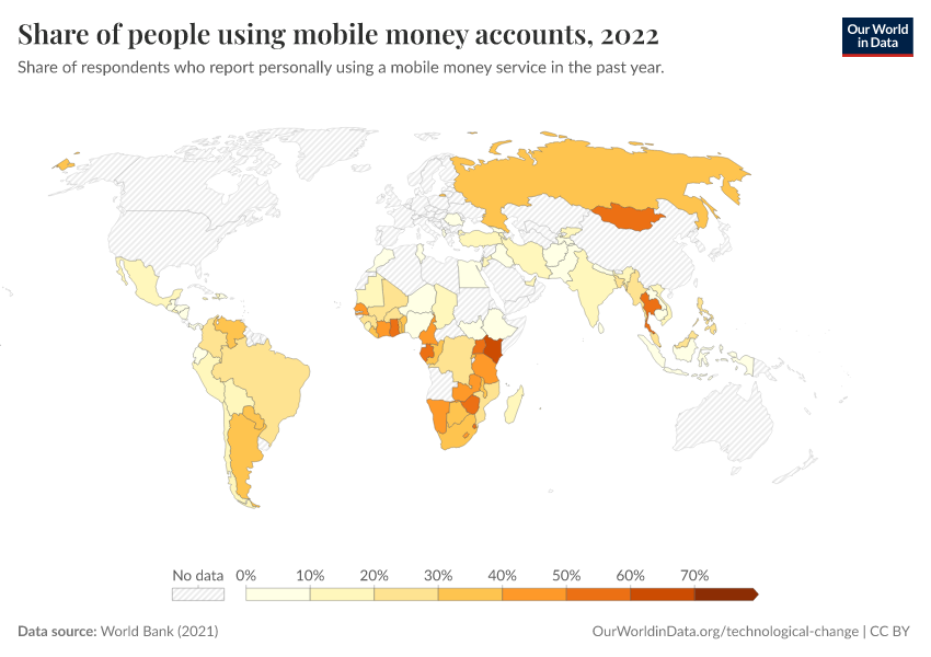 “Data Page: Share of people using mobile money accounts”, part of the following publication: Max Roser, Bertha Rohenkohl, Pablo Arriagada, Joe Hasell, Hannah Ritchie, and Esteban Ortiz-Ospina (2023) - “Economic Growth”. Data adapted from World Bank. Retrieved from https://edit-mdim.owid.pages.dev:8789/20250909-093708/grapher/mobile-money-account-usage.html [online resource] (archived on September 9, 2025).How to cite this data