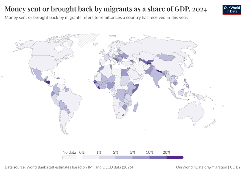 “Data Page: Money sent or brought back by migrants as a share of GDP”. Our World in Data (2026). Data adapted from World Bank staff estimates based on IMF and OECD data. Retrieved from https://edit-mdim.owid.pages.dev:8789/20260202-181317/grapher/money-sent-or-brought-back-by-migrants-as-a-share-of-gdp.html [online resource] (archived on February 2, 2026).How to cite this data