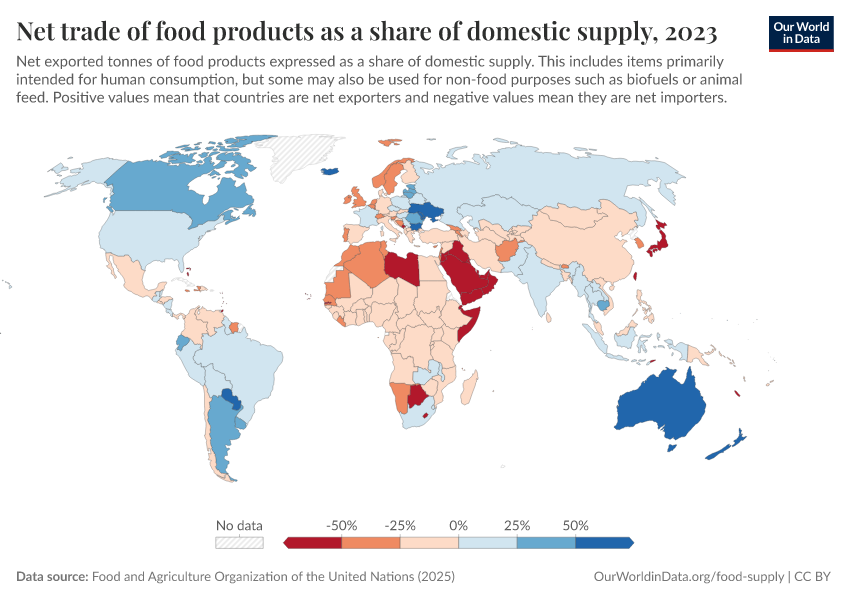 “Data Page: Net trade of food products as a share of domestic supply”, part of the following publication: Hannah Ritchie, Pablo Rosado, and Max Roser (2023) - “Agricultural Production”. Data adapted from Food and Agriculture Organization of the United Nations. Retrieved from https://edit-mdim.owid.pages.dev:8789/20260116-144923/grapher/net-food-trade-as-a-share-of-domestic-supply.html [online resource] (archived on January 16, 2026).How to cite this data