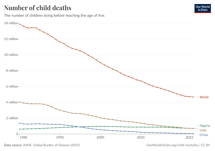 IHME, Global Burden of Disease (2025) – with major processing by Our World in Data. “Number of child deaths” [dataset]. IHME, Global Burden of Disease, “Global Burden of Disease - Deaths” [original data]. Retrieved February 24, 2026 from https://edit-mdim.owid.pages.dev:8789/20260211-174736/grapher/number-of-child-deaths.html (archived on February 11, 2026).
