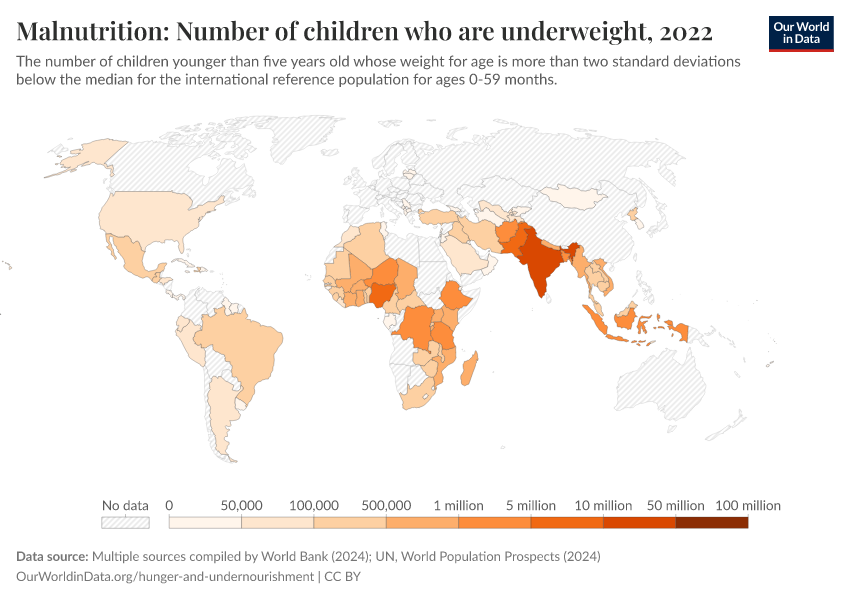 “Data Page: Number of underweight children”. Our World in Data (2026). Data adapted from UNICEF, WHO, World Bank, United Nations. Retrieved from https://edit-mdim.owid.pages.dev:8789/20260119-070102/grapher/number-of-children-who-are-underweight.html [online resource] (archived on January 19, 2026).How to cite this data