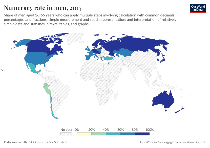 “Data Page: Numeracy rate in men”. Our World in Data (2026). Data adapted from UNESCO Institute for Statistics. Retrieved from https://edit-mdim.owid.pages.dev:8789/20251120-211749/grapher/numeracy-rate-in-adult-men.html [online resource] (archived on November 20, 2025).How to cite this data