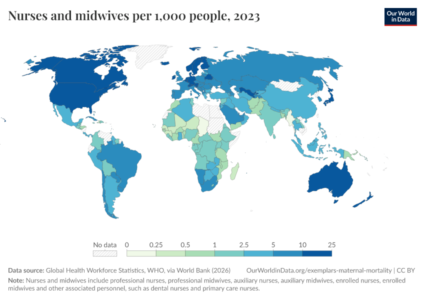 “Data Page: Nurses and midwives per 1,000 people”. Our World in Data (2026). Data adapted from Global Health Workforce Statistics, WHO, via World Bank. Retrieved from https://edit-mdim.owid.pages.dev:8789/20260202-181317/grapher/nurses-and-midwives-per-1000-people.html [online resource] (archived on February 2, 2026).
