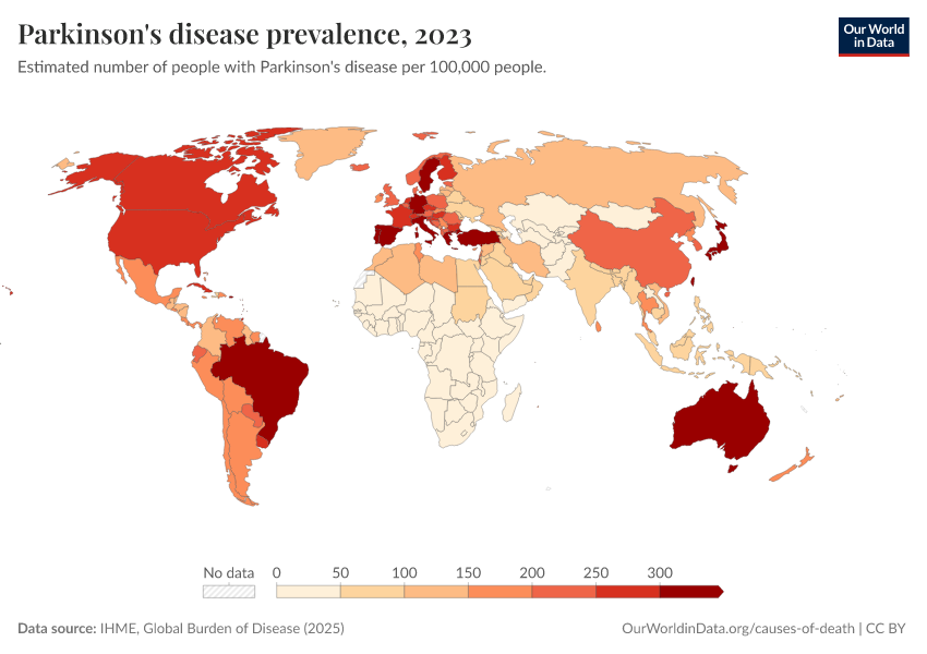 “Data Page: Parkinson's disease prevalence”, part of the following publication: Esteban Ortiz-Ospina and Max Roser (2016) - “Global Health”. Data adapted from IHME, Global Burden of Disease. Retrieved from https://edit-mdim.owid.pages.dev:8789/20260212-172859/grapher/parkinsons-disease-prevalence-ihme.html [online resource] (archived on February 12, 2026).How to cite this data