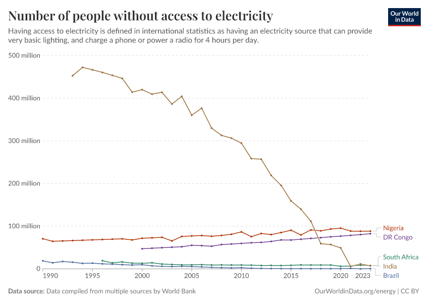 “Data Page: Number of people without access to electricity”, part of the following publication: Hannah Ritchie, Pablo Rosado, and Max Roser (2019) - “Access to Energy”. Data adapted from SDG 7.1.1 Electrification Dataset, World Bank, via World Bank, United Nations Population Division, national statistical offices, and Eurostat, via World Bank. Retrieved from https://edit-mdim.owid.pages.dev:8789/20260202-181317/grapher/people-without-electricity-country.html [online resource] (archived on February 2, 2026).How to cite this data