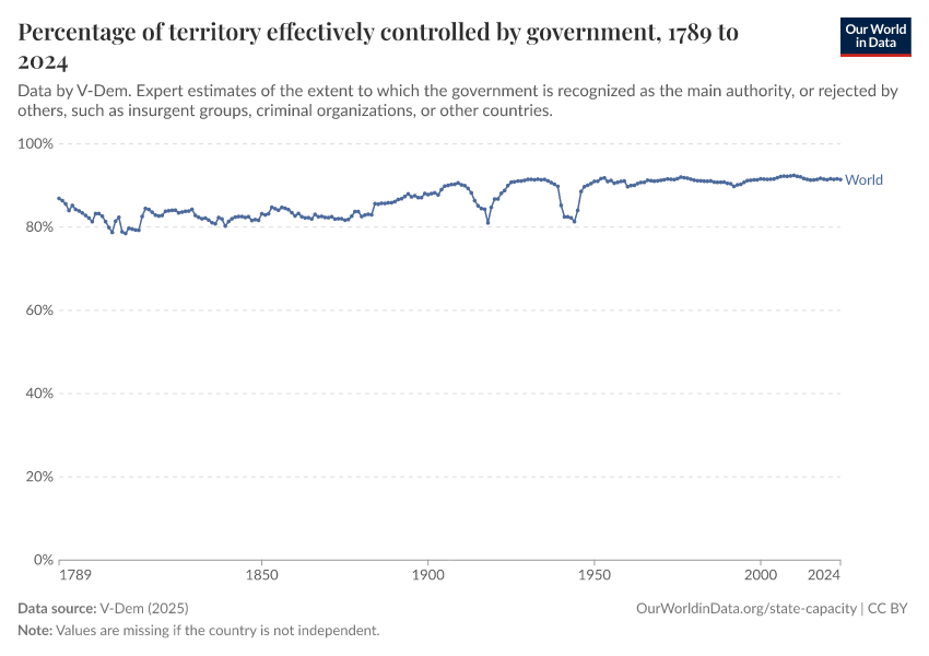 “Data Page: Territory under state control”, part of the following publication: Bastian Herre, Lucas Rodés-Guirao, and Esteban Ortiz-Ospina (2013) - “Democracy”. Data adapted from V-Dem. Retrieved from https://edit-mdim.owid.pages.dev:8789/20260119-070102/grapher/percentage-of-territory-controlled-by-government.html [online resource] (archived on January 19, 2026).How to cite this data