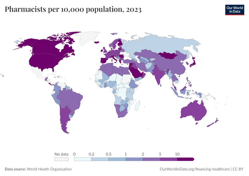 “Data Page: Pharmacists per 10,000 population”. Our World in Data (2026). Data adapted from World Health Organization. Retrieved from https://edit-mdim.owid.pages.dev:8789/20260130-180113/grapher/pharmaceutical-personnel-per-1000.html [online resource] (archived on January 30, 2026).How to cite this data