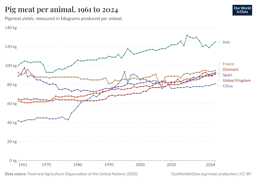 Food and Agriculture Organization of the United Nations (2025) – with major processing by Our World in Data. “Pig meat yield per animal – UN FAO” [dataset]. Food and Agriculture Organization of the United Nations, “Production: Crops and livestock products” [original data]. Retrieved February 24, 2026 from https://edit-mdim.owid.pages.dev:8789/20260116-143329/grapher/pig-yields-meat-per-animal-in-hectograms-100-grams.html (archived on January 16, 2026).