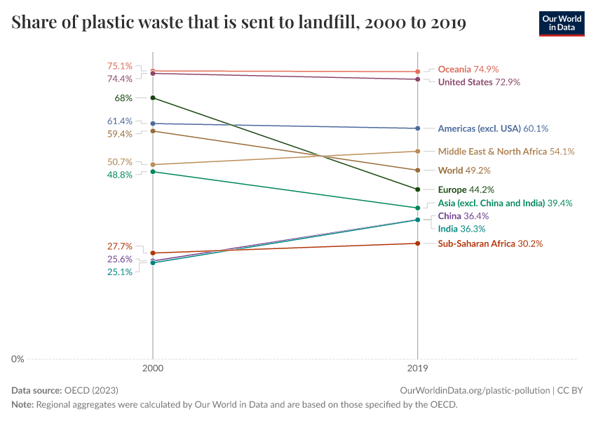 “Data Page: Share of plastic waste that is sent to landfill”, part of the following publication: Hannah Ritchie, Veronika Samborska, and Max Roser (2023) - “Plastic Pollution”. Data adapted from OECD. Retrieved from https://edit-mdim.owid.pages.dev:8789/20250909-093708/grapher/plastic-waste-landfill.html [online resource] (archived on September 9, 2025).How to cite this data