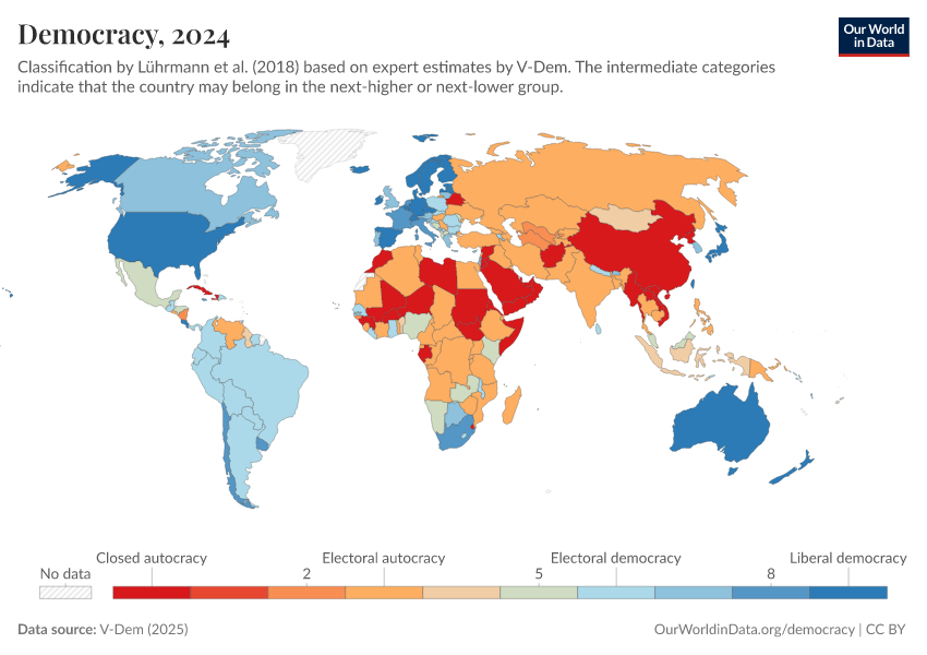 “Data Page: Political regime”, part of the following publication: Bastian Herre, Lucas Rodés-Guirao, and Esteban Ortiz-Ospina (2013) - “Democracy”. Data adapted from V-Dem. Retrieved from https://edit-mdim.owid.pages.dev:8789/20260119-070102/grapher/political-regime-amb-row.html [online resource] (archived on January 19, 2026).How to cite this data