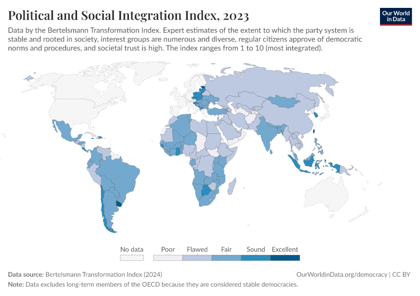 “Data Page: Political and Social Integration Index”, part of the following publication: Bastian Herre, Lucas Rodés-Guirao, and Esteban Ortiz-Ospina (2013) - “Democracy”. Data adapted from Bertelsmann Transformation Index. Retrieved from https://edit-mdim.owid.pages.dev:8789/20260105-133053/grapher/political-social-integration-index-bti.html [online resource] (archived on January 5, 2026).How to cite this data