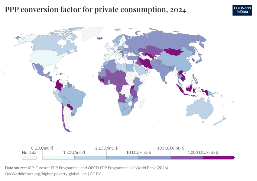 “Data Page: PPP conversion factor for private consumption”. Our World in Data (2026). Data adapted from ICP, Eurostat PPP Programme, and OECD PPP Programme, via World Bank. Retrieved from https://edit-mdim.owid.pages.dev:8789/20260202-181317/grapher/ppp-conversion-factor-for-private-consumption.html [online resource] (archived on February 2, 2026).How to cite this data