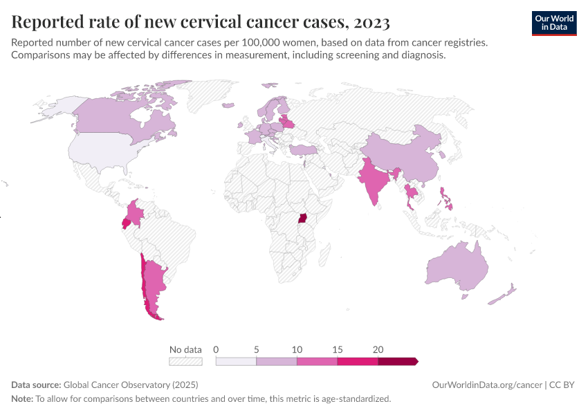 Global Cancer Observatory (2025) – processed by Our World in Data. “Reported rate of new cervical cancer cases” [dataset]. Global Cancer Observatory, “Cancer over time - Cervical cancer” [original data]. Retrieved February 24, 2026 from https://edit-mdim.owid.pages.dev:8789/20250909-093708/grapher/reported-rate-of-new-cervical-cancer-cases.html (archived on September 9, 2025).