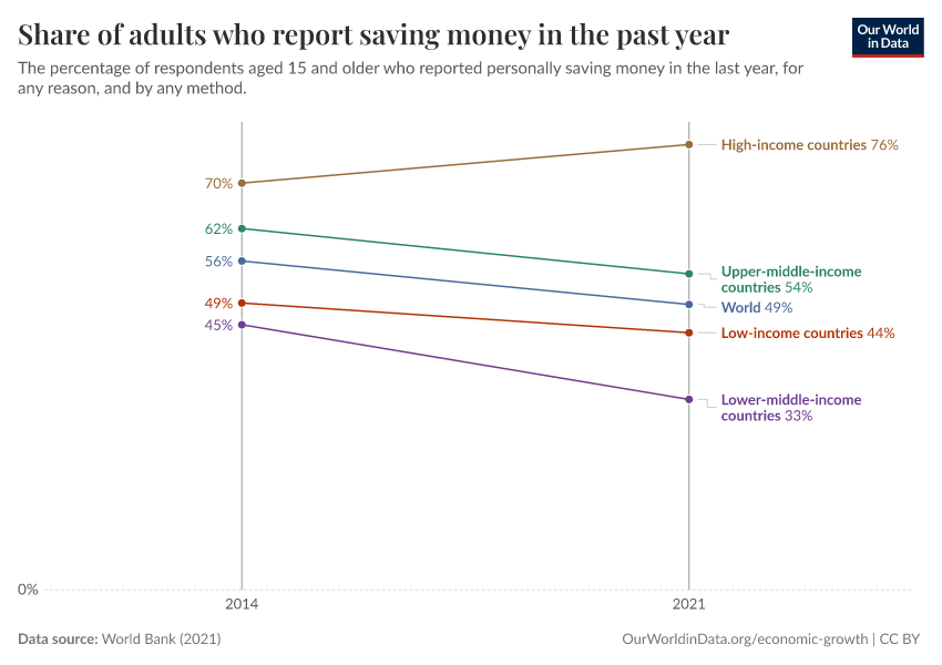 “Data Page: Share of adults who report saving money in the past year”, part of the following publication: Max Roser, Bertha Rohenkohl, Pablo Arriagada, Joe Hasell, Hannah Ritchie, and Esteban Ortiz-Ospina (2023) - “Economic Growth”. Data adapted from World Bank. Retrieved from https://edit-mdim.owid.pages.dev:8789/20250909-093708/grapher/share-of-adults-who-report-saving-money-in-the-past-year.html [online resource] (archived on September 9, 2025).How to cite this data