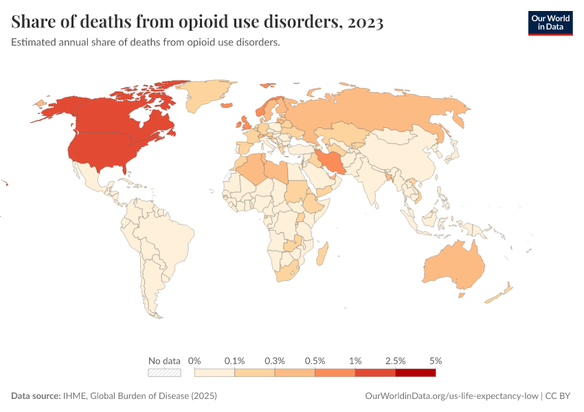 IHME, Global Burden of Disease (2025) – with major processing by Our World in Data. “Share of deaths from opioid use disorders” [dataset]. IHME, Global Burden of Disease, “Global Burden of Disease - Deaths” [original data]. Retrieved February 24, 2026 from https://edit-mdim.owid.pages.dev:8789/20260211-174736/grapher/share-of-deaths-from-opioid-overdoses.html (archived on February 11, 2026).