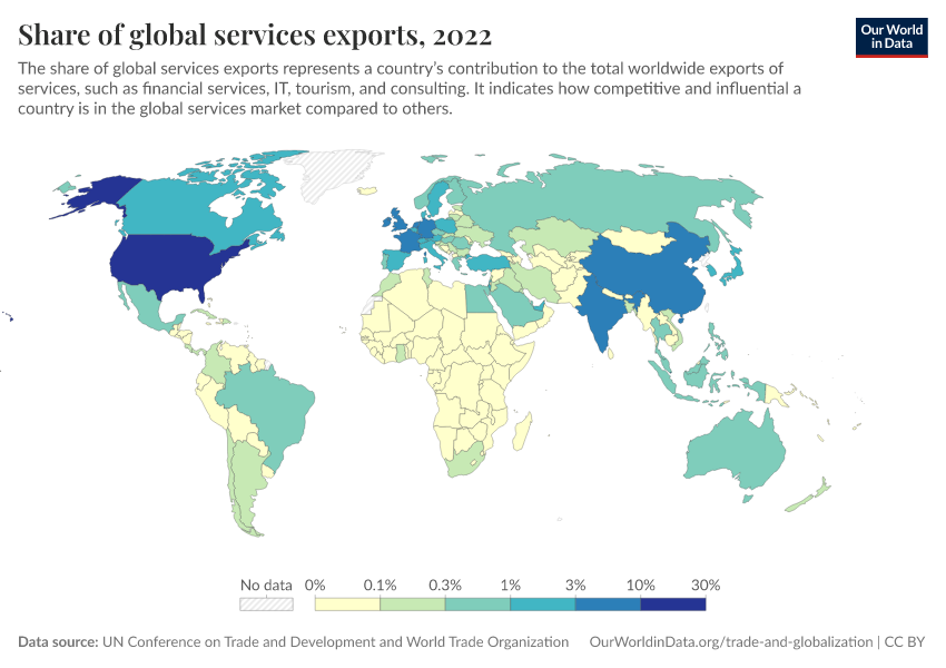 “Data Page: Share of global services exports”. Our World in Data (2026). Data adapted from UN Conference on Trade and Development and World Trade Organization. Retrieved from https://edit-mdim.owid.pages.dev:8789/20260130-180113/grapher/share-of-global-services-exports.html [online resource] (archived on January 30, 2026).How to cite this data