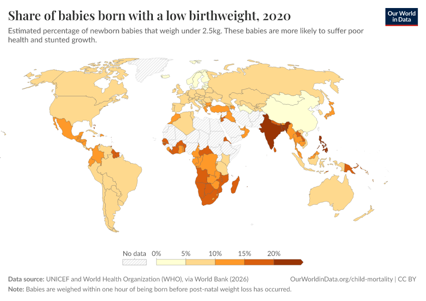 “Data Page: Share of babies born with a low birthweight”. Our World in Data (2026). Data adapted from UNICEF and World Health Organization (WHO), via World Bank. Retrieved from https://edit-mdim.owid.pages.dev:8789/20260202-181317/grapher/share-of-low-birthweight-babies-born.html [online resource] (archived on February 2, 2026).How to cite this data