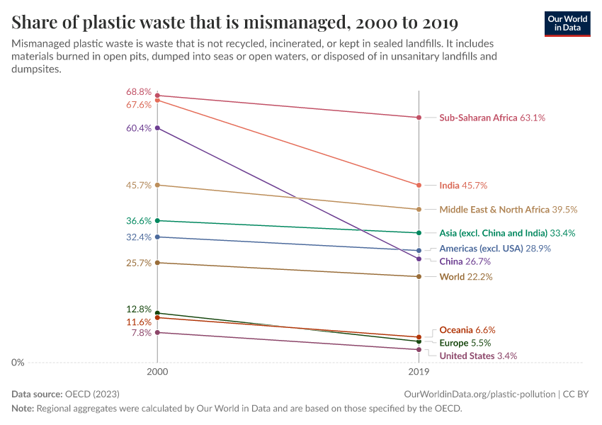 OECD (2023) – processed by Our World in Data. “Share of plastic waste that is mismanaged” [dataset]. OECD, “Global Plastics Outlook - Plastics waste by region and end-of-life fate” [original data]. Retrieved February 24, 2026 from https://edit-mdim.owid.pages.dev:8789/20250909-093708/grapher/share-of-plastic-waste-that-is-mismanaged.html (archived on September 9, 2025).