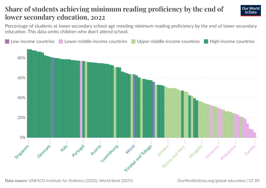 “Data Page: Share of students achieving minimum reading proficiency by the end of lower secondary education”, part of the following publication: Hannah Ritchie, Veronika Samborska, Esteban Ortiz-Ospina, and Max Roser (2023) - “Global Education”. Data adapted from UNESCO Institute for Statistics. Retrieved from https://edit-mdim.owid.pages.dev:8789/20260122-091445/grapher/share-of-students-at-end-of-lower-secondary-education-with-minimum-reading-proficiency.html [online resource] (archived on January 22, 2026).How to cite this data