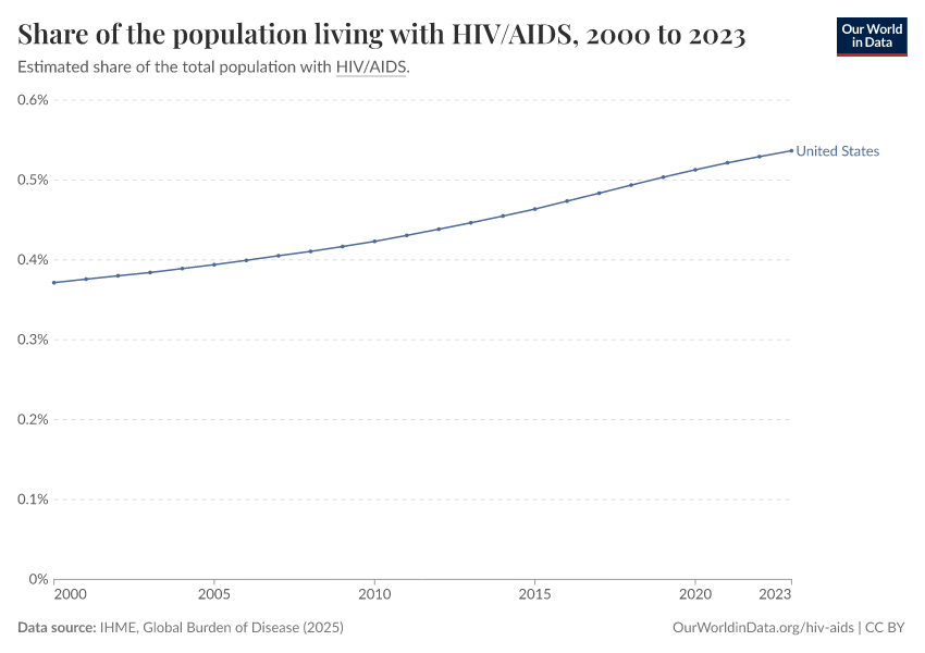 IHME, Global Burden of Disease (2025) – with major processing by Our World in Data. “Share of the population living with HIV/AIDS” [dataset]. IHME, Global Burden of Disease, “Global Burden of Disease - Prevalence and Incidence” [original data]. Retrieved February 24, 2026 from https://edit-mdim.owid.pages.dev:8789/20260212-172859/grapher/share-of-the-population-living-with-hivaids.html (archived on February 12, 2026).