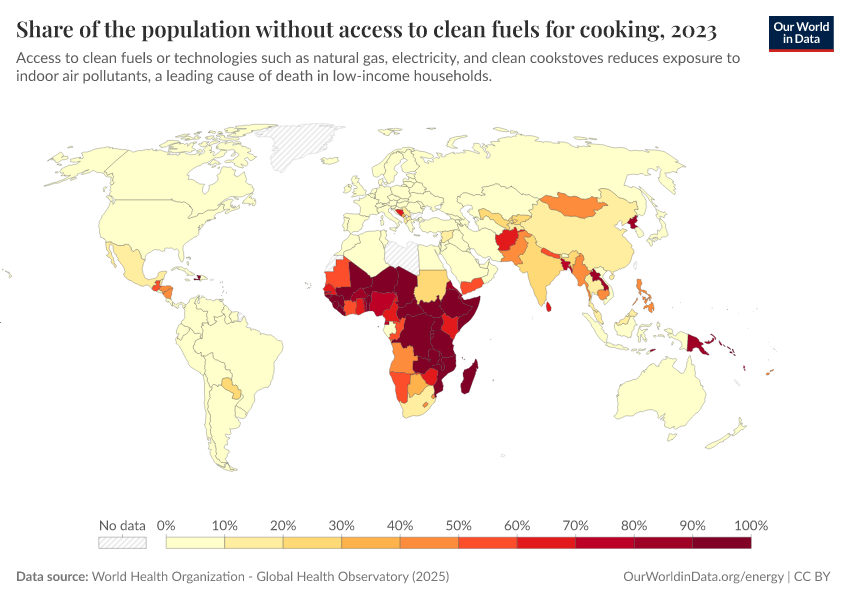 World Health Organization - Global Health Observatory (2025) – processed by Our World in Data. “Share of the population without access to clean fuels for cooking” [dataset]. World Health Organization, “Global Health Observatory” [original data]. Retrieved February 24, 2026 from https://edit-mdim.owid.pages.dev:8789/20260119-070102/grapher/share-of-the-population-without-access-to-clean-fuels-for-cooking.html (archived on January 19, 2026).