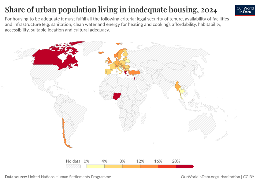 United Nations Human Settlements Programme – processed by Our World in Data. “Share of urban population living in inadequate housing” [dataset]. United Nations Human Settlements Programme, “Data from multiple sources” [original data]. Retrieved February 24, 2026 from https://edit-mdim.owid.pages.dev:8789/20251120-211749/grapher/share-of-urban-population-living-in-inadequate-housing.html (archived on November 20, 2025).