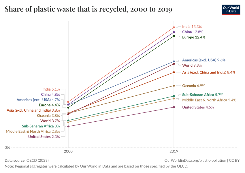 “Data Page: Share of plastic waste that is recycled”, part of the following publication: Hannah Ritchie, Veronika Samborska, and Max Roser (2023) - “Plastic Pollution”. Data adapted from OECD. Retrieved from https://edit-mdim.owid.pages.dev:8789/20250909-093708/grapher/share-plastic-waste-recycled.html [online resource] (archived on September 9, 2025).How to cite this data
