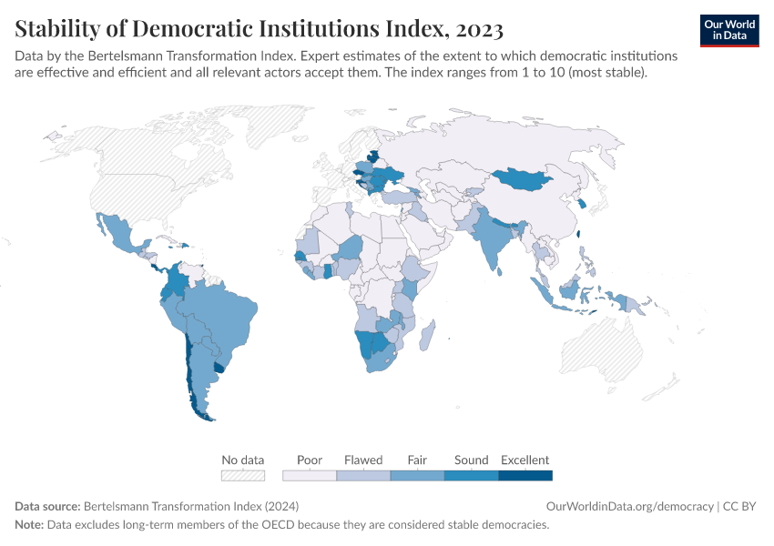 “Data Page: Stability of Democratic Institutions Index”, part of the following publication: Bastian Herre, Lucas Rodés-Guirao, and Esteban Ortiz-Ospina (2013) - “Democracy”. Data adapted from Bertelsmann Transformation Index. Retrieved from https://edit-mdim.owid.pages.dev:8789/20260105-133053/grapher/stability-democratic-institutions-index-bti.html [online resource] (archived on January 5, 2026).How to cite this data