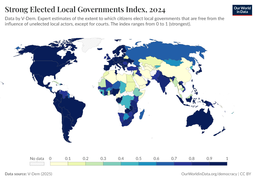 V-Dem (2025) – processed by Our World in Data. “Elected local governments – V-Dem” [dataset]. V-Dem, “Democracy report v15” [original data]. Retrieved February 24, 2026 from https://edit-mdim.owid.pages.dev:8789/20260119-070102/grapher/strong-elected-local-governments-index.html (archived on January 19, 2026).