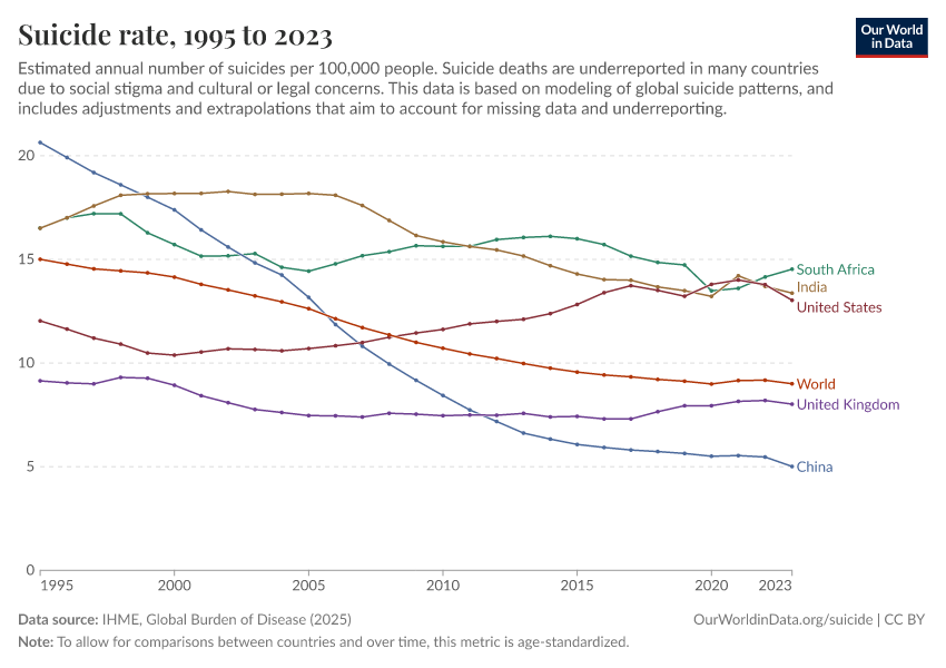 “Data Page: Suicide rate”, part of the following publication: Esteban Ortiz-Ospina and Max Roser (2016) - “Global Health”. Data adapted from IHME, Global Burden of Disease. Retrieved from https://edit-mdim.owid.pages.dev:8789/20260211-173942/grapher/suicide-death-rates.html [online resource] (archived on February 11, 2026).How to cite this data