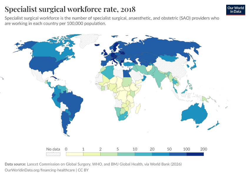 “Data Page: Specialist surgical workforce rate”. Our World in Data (2026). Data adapted from Lancet Commission on Global Surgery, WHO, and BMJ Global Health, via World Bank. Retrieved from https://edit-mdim.owid.pages.dev:8789/20260202-181317/grapher/surgeons-per-100000.html [online resource] (archived on February 2, 2026).How to cite this data